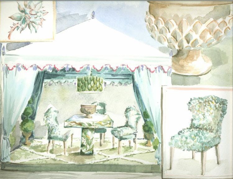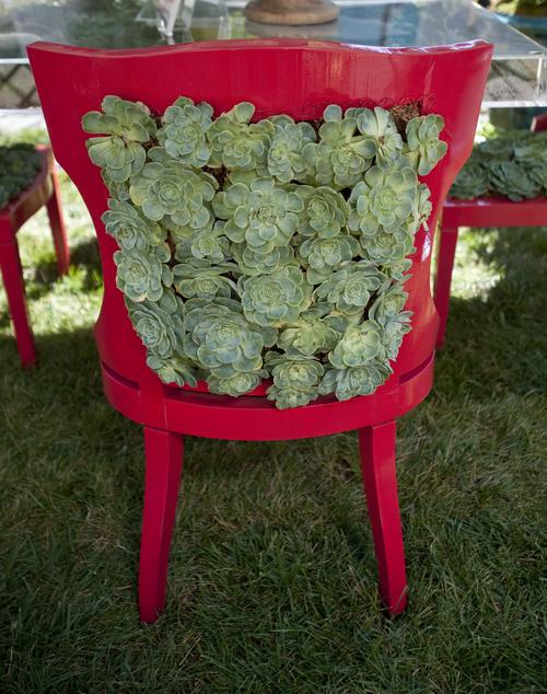 “I think it’s amazing how different colors in plants and nature can be matched with fabrics. I like the light green in the succulents that I used to façade the chairs – it has some blue in the green and this green works very well with the draperies. I painted the chairs hot pink to match the little bit of hot pink trim on the tent. I like that pop of bright color outside, especially using greens and natural colors where things can become dull without it. Of course the vignette is not realistic to sit in, but it makes you think about how important furniture is to each individual, and how we use it in our homes.”