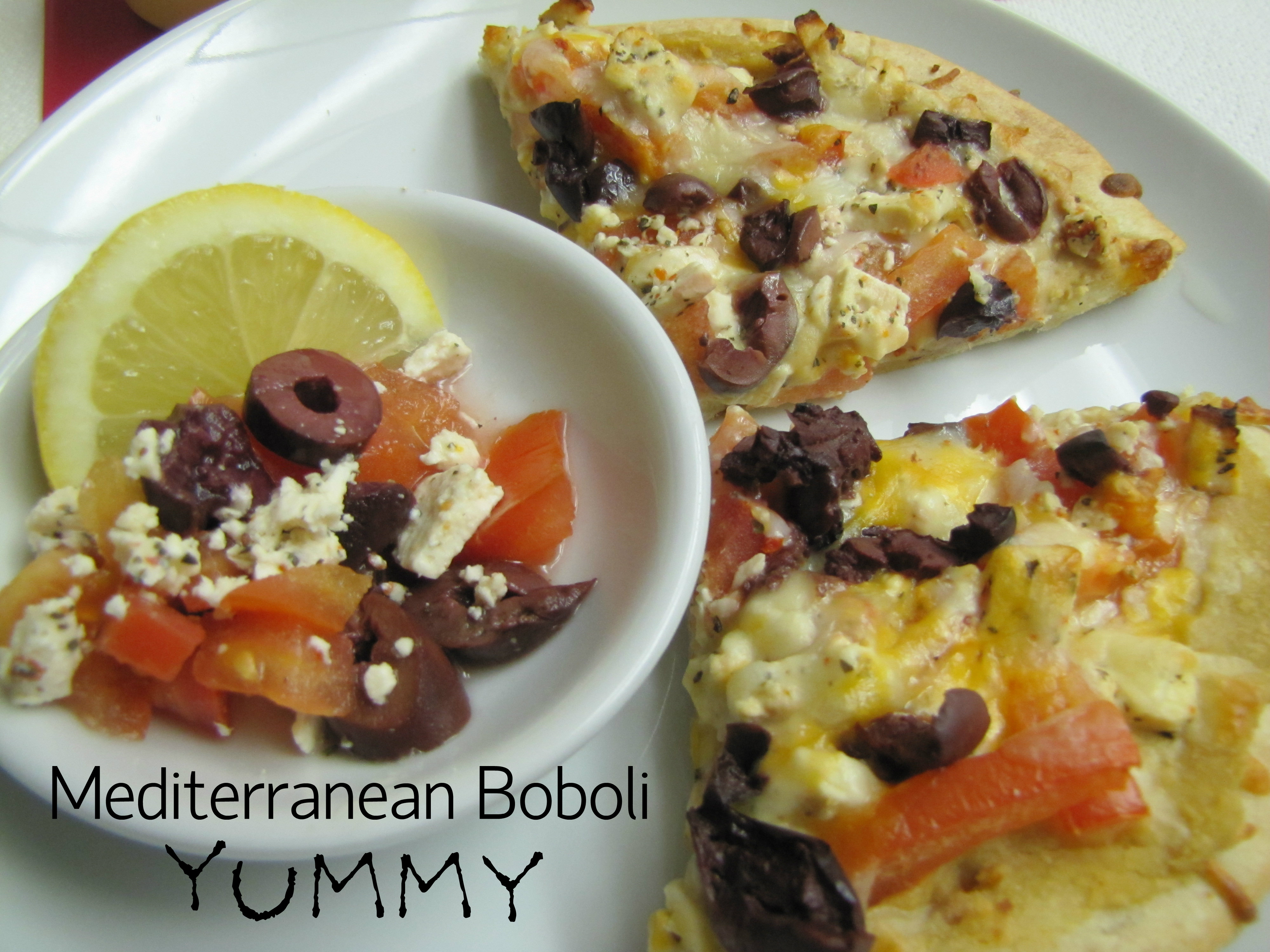 Preheat oven to 415 degrees. Spread hummus on Boboli, sprinkle with chopped tomatoes, chopped olives and feta cheese. Bake for 12 – 15 minutes on cooking tray and another 3 – 5 minutes on the rack for more crisp. Remove from the oven and let cool for about 5 minutes. Drizzle with lemon.
