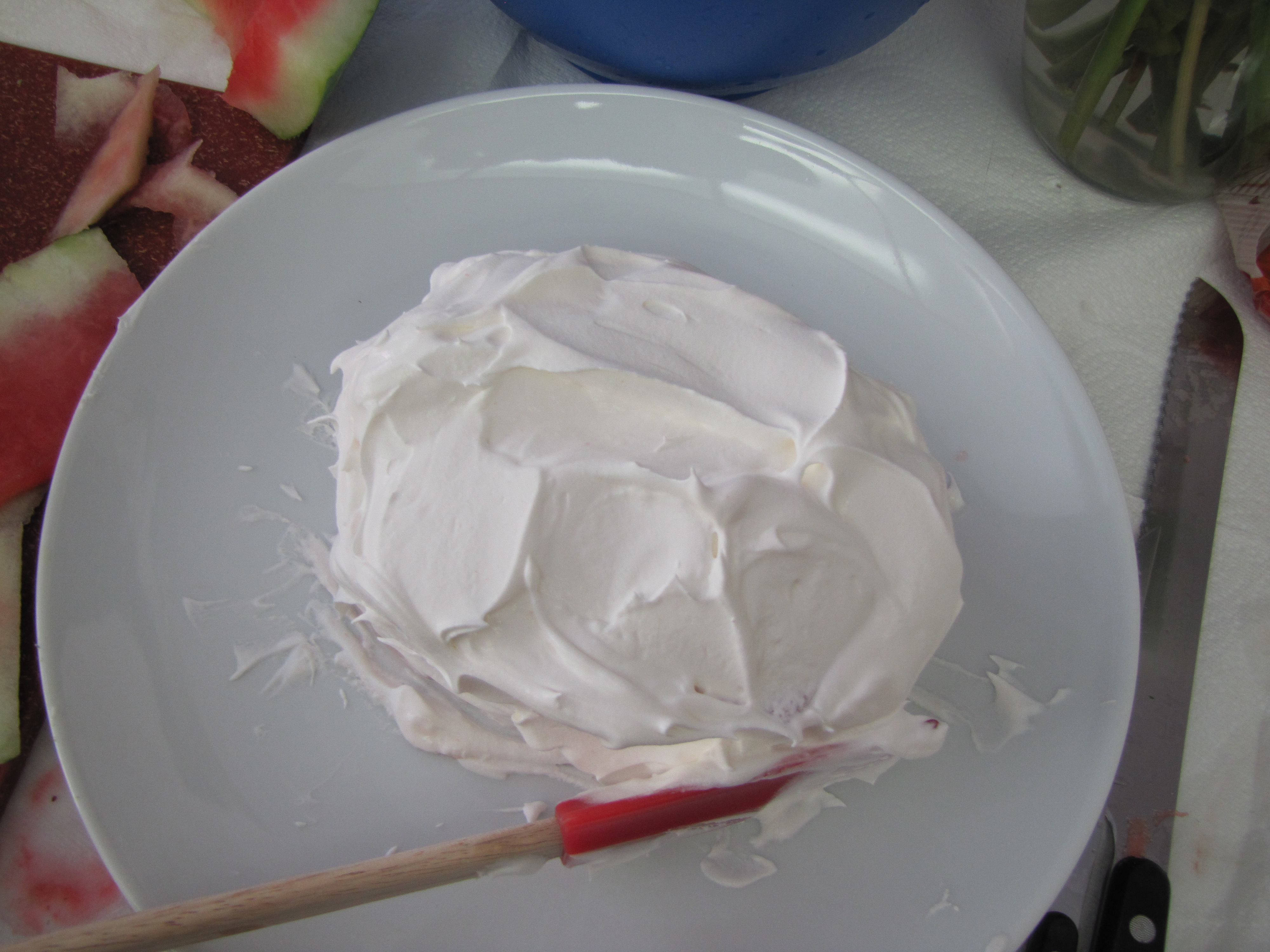 Once you have the watermelon into the shape of a cylinder frost it with the Cool Whip